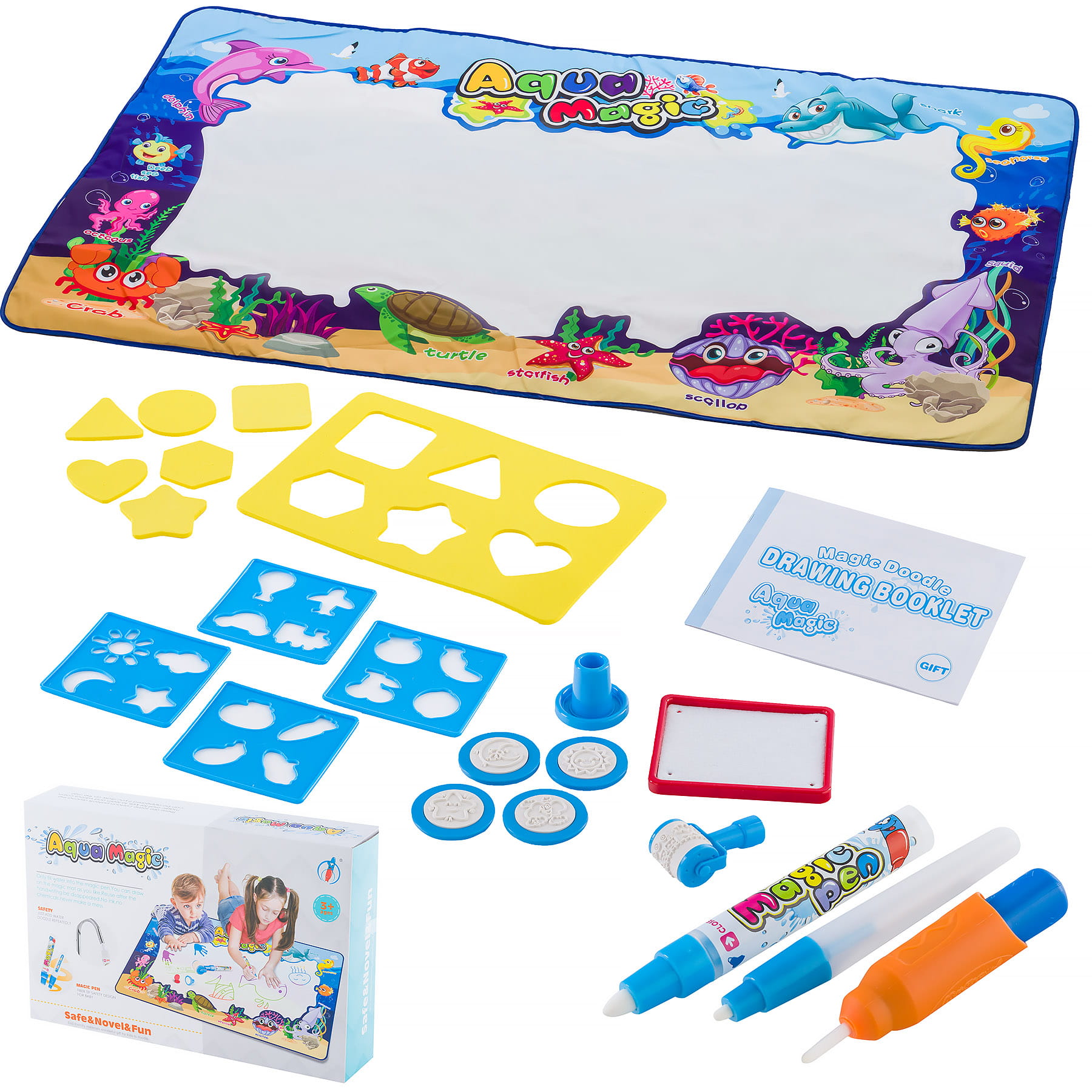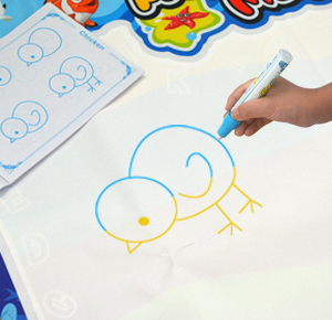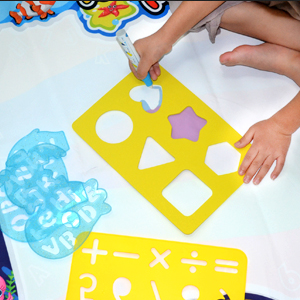 W skład zestawu wchodzą różnorodne szablony, pieczątki, mazaki z różnymi końcówkami oraz książeczka która krok po kroku nauczy dziecko w jaki sposób rysować podstawowe kształty czy zwierzątka. Mata posiada na brzegach ukryte literki oraz cyferki które ukażą się po zamalowaniu ich wodą. Jest to doskonały sposób aby uczyć się poprzez zabawę.